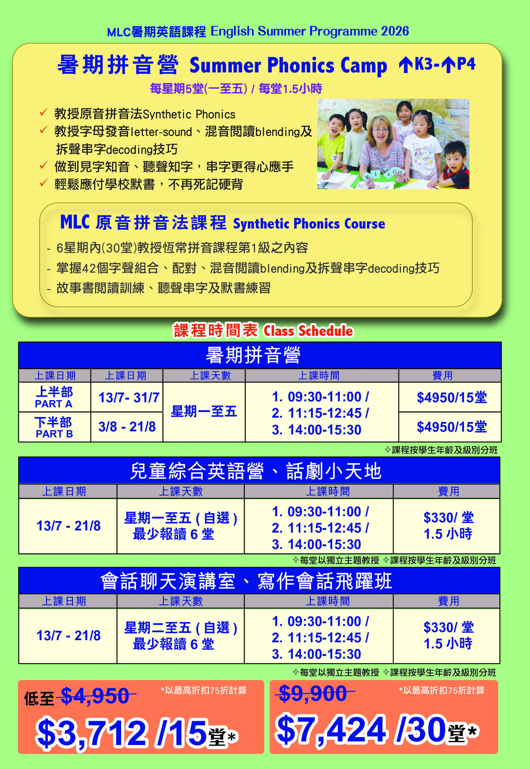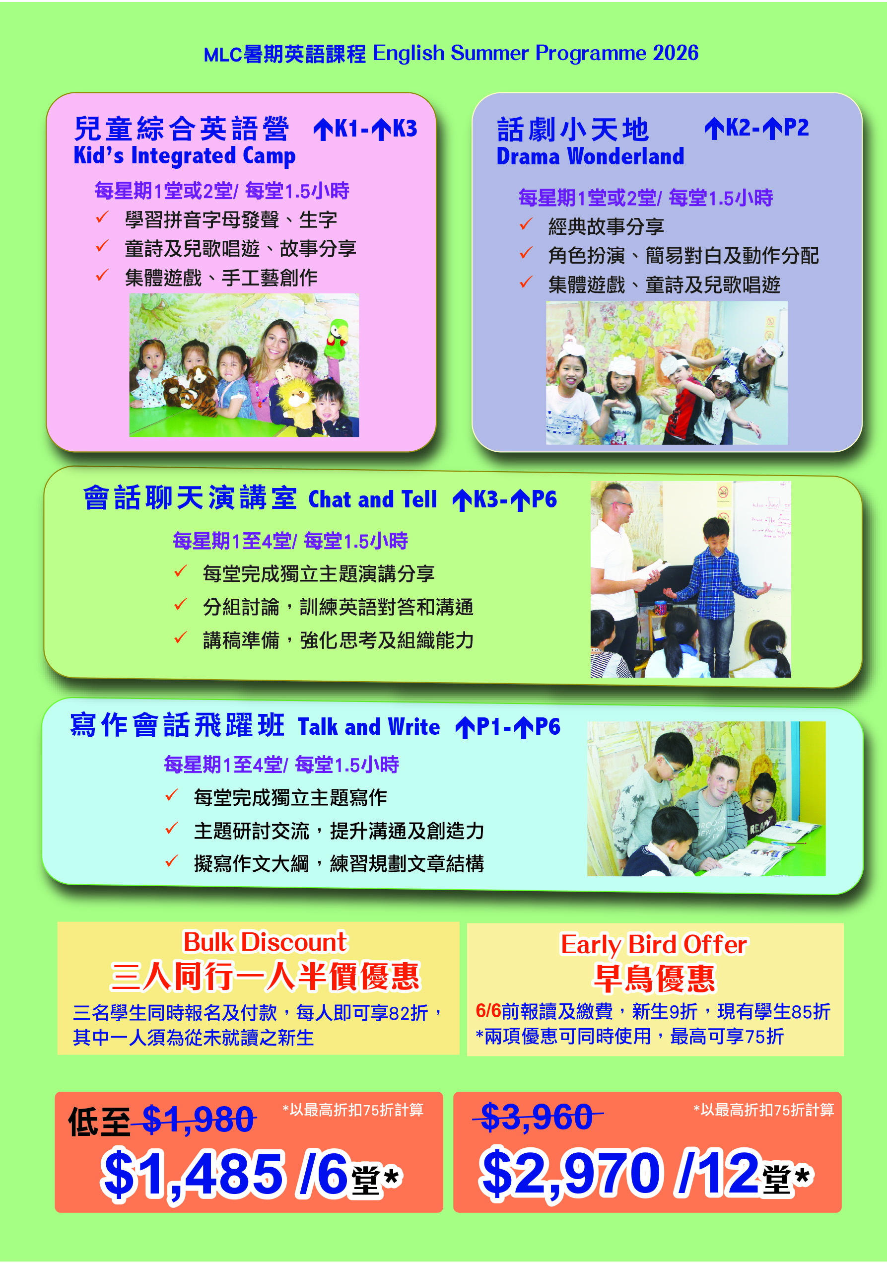 “Early Bird Offer : 憑單張上之印花於6月6日前報讀及繳費,新生9折,現就讀學生85折”